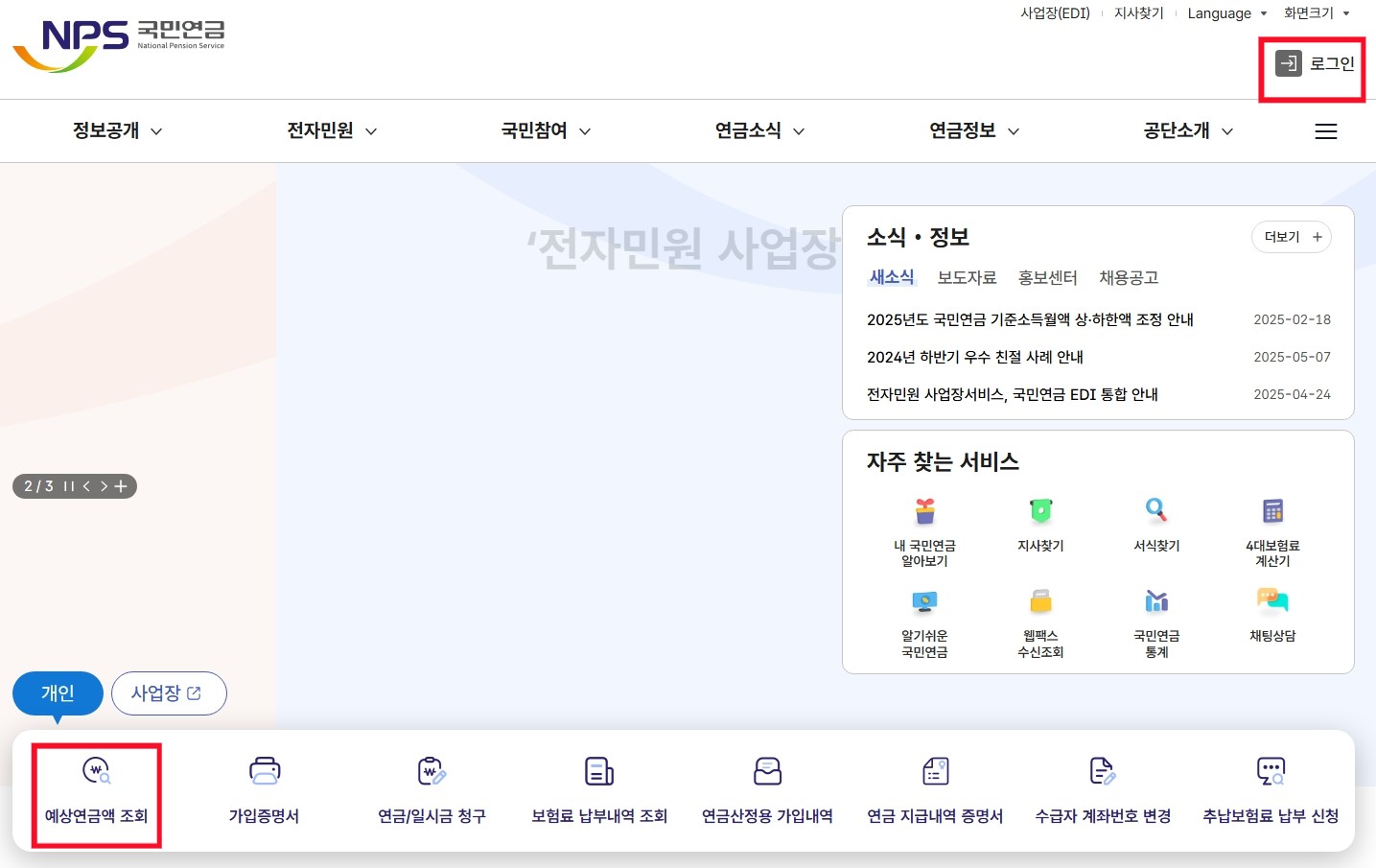 공인인증서(공동인증서)를 PC에 준비 후, 국민연금공단 웹사이트에 로그인합니다 .