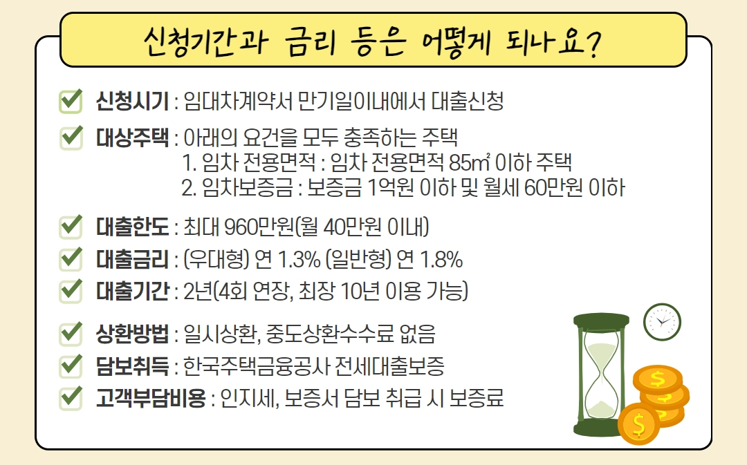 • 주거안정 월세대출 대출기간: 기본 2년(4회 연장, 최대 10년 가능)